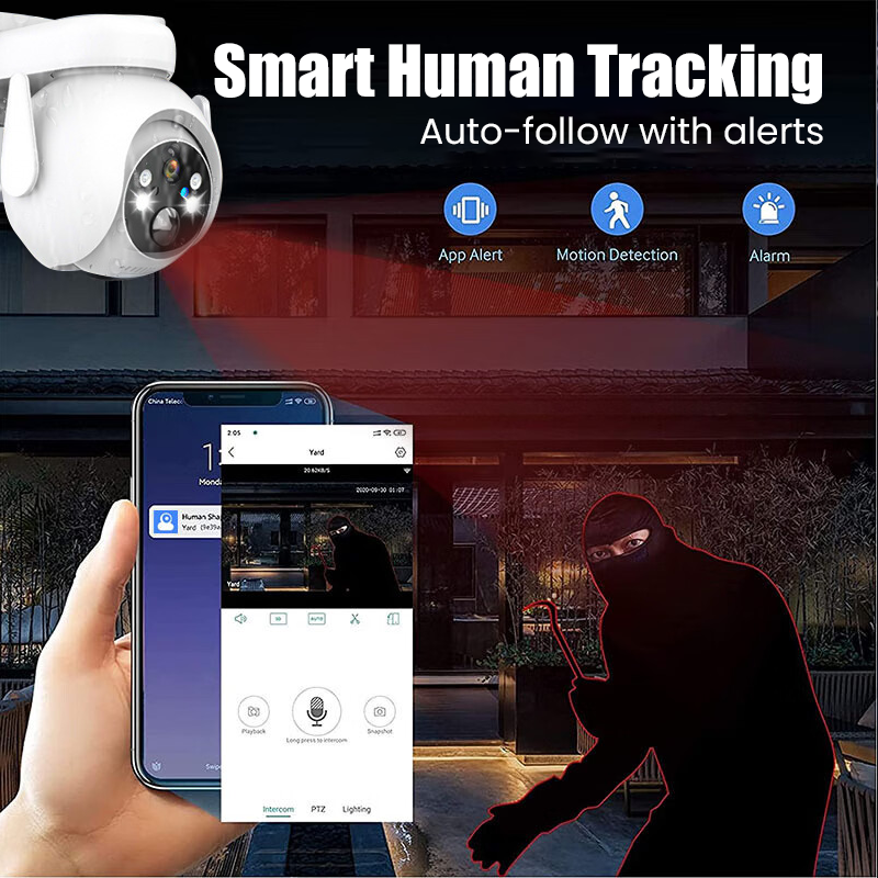 INTELLIGENT HUMAN DETECTION AND TRACKING: The camera auto-tracks human movement and instantly sends alerts to your phone via the mobile app. Never miss suspicious activity around your home or property.